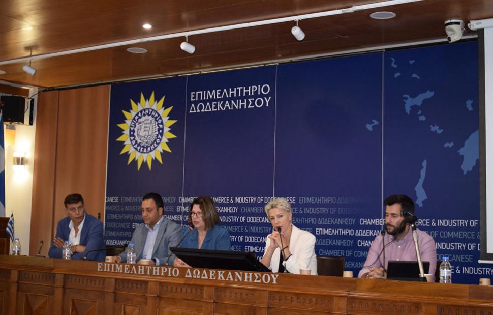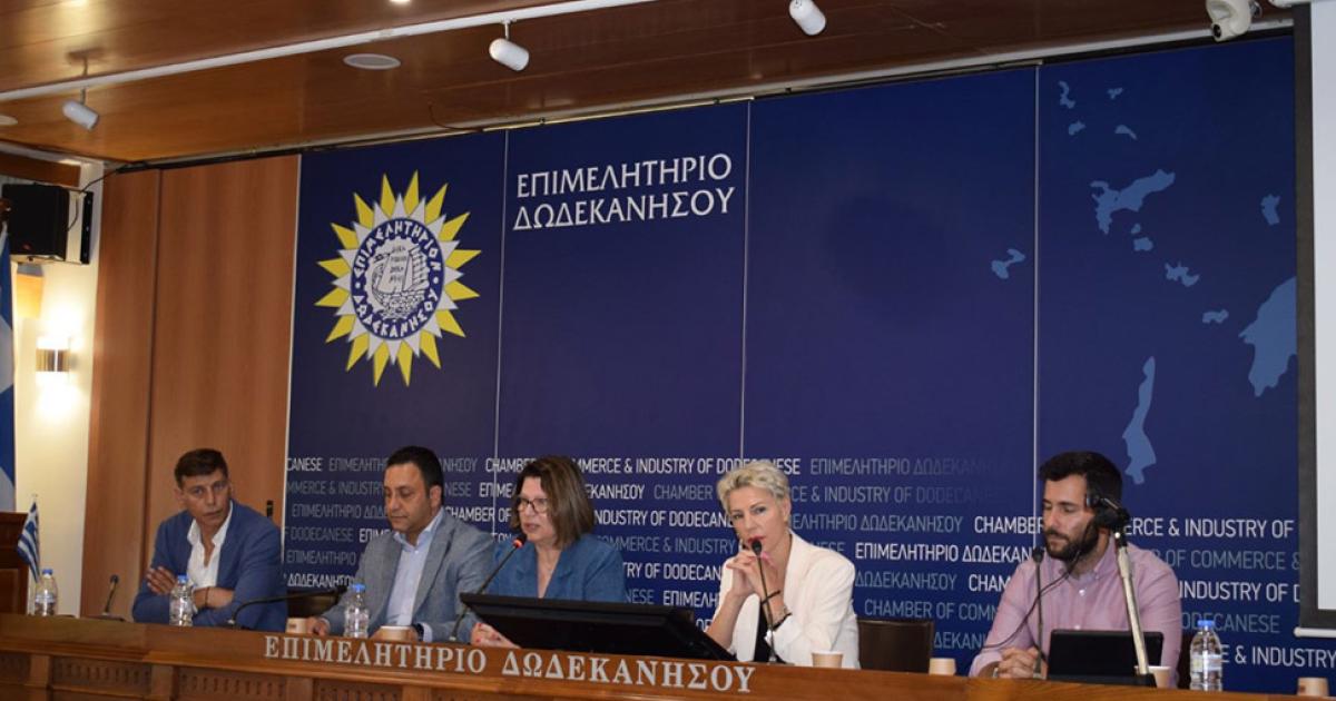Χαιρετισμό στην Ημερίδα απηύθυναν οι κ.κ. Κάλλιστος Διακογεωργίου, Αντιπεριφερειάρχης Ενέργειας, Βιομηχανίας και Φυσικών Πόρων της Περιφέρειας Νοτίου Αιγαίου, Νίκος Καλαμαρίτης, Αντιδήμαρχος Δήμου Ρόδου, Γιάννης Πάππου, πρόεδρος του Επιμελητηρίου Δωδεκανήσου, Αλέξανδρος Πασσάλης, εντεταλμένος σύμβουλος για θέματα Περιβάλλοντος της Ένωσης Ξενοδόχων Ρόδου.