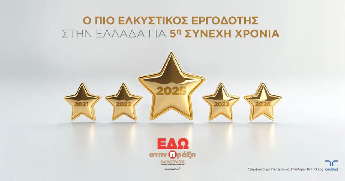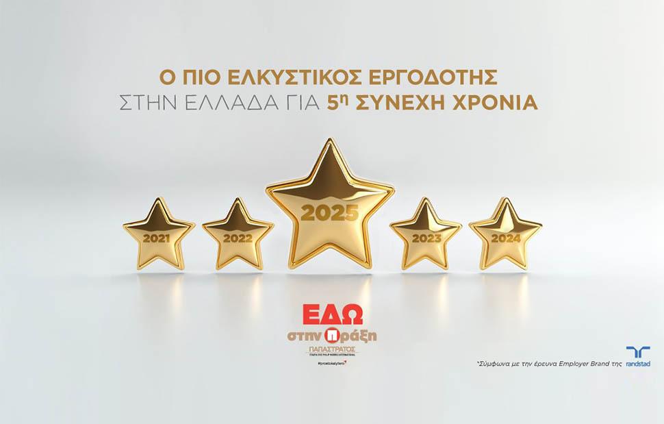 Η Παπαστράτος παραμένει σταθερά προσηλωμένη στη δημιουργία ενός υγιούς, σύγχρονου και ανθρώπινου περιβάλλοντος εργασίας. Η δέσμευση αυτή αναγνωρίζεται για ακόμη μία χρονιά, με την εταιρεία να αναδεικνύεται ως «Ο Πιο Ελκυστικός Εργοδότης στην Ελλάδα» για το 2025, σύμφωνα με την έρευνα Employer Brand της Randstad (REBR) - για 5η συνεχή χρονιά.