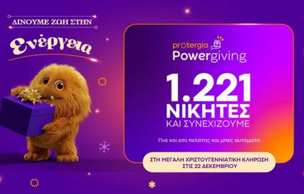 Μέχρι και σήμερα η πρωτοβουλία της Protergia, της ενέργειας της METLEN, μετά από 11 μηνιαίες κληρώσεις έχει ήδη αναδείξει 121 νικητές, οι οποίοι έχουν μοιραστεί το τεράστιο χρηματικό ποσό του 1.100.000€, ενώ ακόμα 1.100 νικητές που απολαμβάνουν δωρεάν λογαριασμούς ενέργειας για έναν χρόνο. Η αυλαία των κληρώσεων του Powergiving για το 2025 πέφτει στις 22 Δεκεμβρίου, με τη μεγάλη χριστουγεννιάτικη κλήρωση.