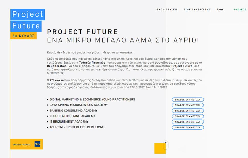 Με νέες εκπαιδεύσεις και συνεργασίες πραγματοποιείται ο 9ος κύκλος του προγράμματος εταιρικής υπευθυνότητας Project Future της Τράπεζας Πειραιώς, το οποίο υλοποιείται σε συνεργασία με το ReGeneration. Το πρόγραμμα συνδέει την τριτοβάθμια εκπαίδευση με την αγορά εργασίας και παρέχει σε νέους και νέες πτυχιούχους τις δεξιότητες που χρειάζονται για την επαγγελματική τους ανέλιξη.