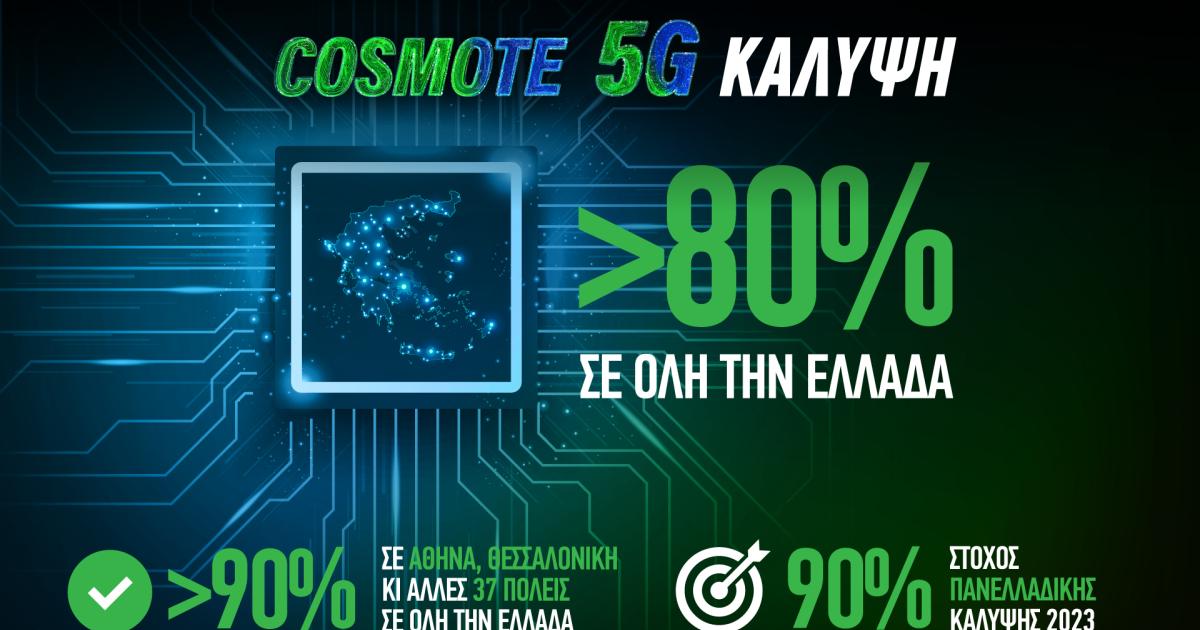 Ξεπέρασε το 80% η πανελλαδική πληθυσμιακή κάλυψη του COSMOTE 5G, του μεγαλύτερου 5G δικτύου της χώρας, με την COSMOTE να πετυχαίνει, και με το παραπάνω, τον φιλόδοξο στόχο που είχε θέσει για το 2022. H πληθυσμιακή 5G κάλυψη έχει ξεπεράσει το 90% σε Αθήνα, Θεσσαλονίκη κι άλλες 37 πόλεις σε όλη την Ελλάδα.