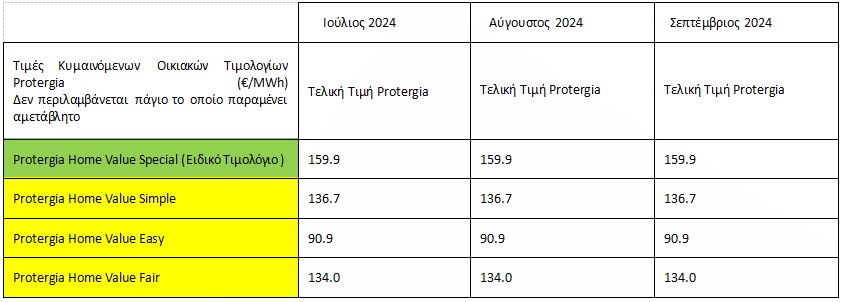 Στον παρακάτω συγκριτικό πίνακα παρατίθενται οι τιμές της Protergia για τον μήνα Σεπτέμβριο για τους οικιακούς καταναλωτές, σε σύγκριση με τους μήνες Ιούλιο και Αύγουστο: