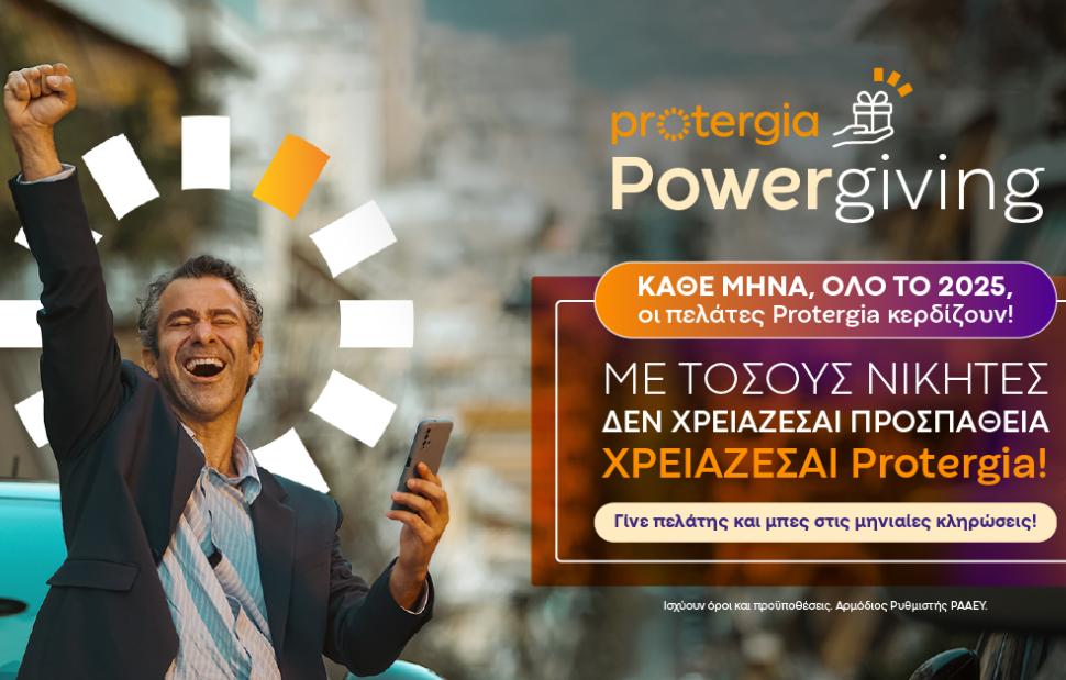 Μάθετε περισσότερα για το Protergia Powergiving και τους όρους συμμετοχής στην επίσημη σελίδα: protergia.gr/powergiving, ενώ στα social media της Protergia σας περιμένουν αποκλειστικά βίντεο με δηλώσεις νικητών και μοναδικό περιεχόμενο για το Powergiving!