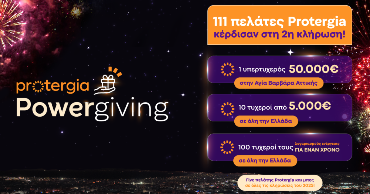 Μέσα από το Powergiving, η Protergia πραγματοποιεί κάθε μήνα για ολόκληρο το 2025 μηνιαίες κληρώσεις με 111 νικητές ανά κλήρωση, προσφέροντας συνολικά περισσότερα από 1.300 δώρα.