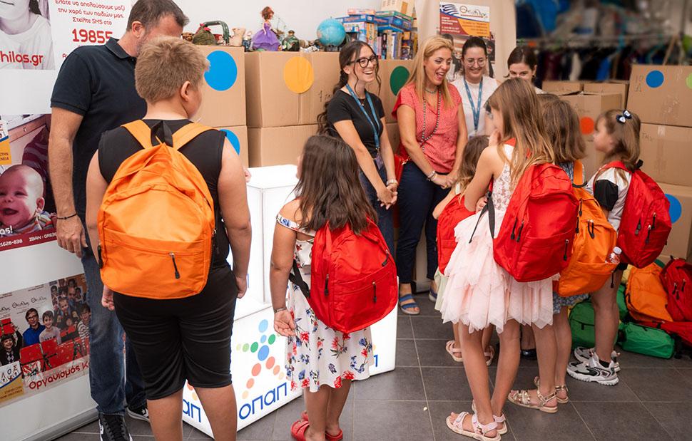Λίγο πριν την έναρξη της νέας σχολικής χρονιάς, ο ΟΠΑΠ προσέφερε σε 350 παιδιά πολύτεκνων οικογενειών, που υποστηρίζονται από τον Οργανισμό Κοινωνικής Φροντίδας ΜΚΟ «Θεόφιλος», σχολικές τσάντες γεμάτες με όλο τον απαραίτητο εξοπλισμό για μια δημιουργική χρονιά. Τετράδια, μολύβια, ξυλομπογιές, μαρκαδόροι, μπλοκ ζωγραφικής, παγούρια και φαγητοδοχεία γέμισαν με χρώμα και αισιοδοξία τα μάτια των μικρών μαθητών.
