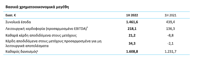 Τα αντίστοιχα Κέρδη μετά από φόρους από συνεχιζόμενες δραστηριότητες χωρίς την επίδραση των μη λειτουργικών αποτελεσμάτων, διαμορφώθηκαν σε € 56,6 εκ. για το Α’ εξάμηνο του 2022 έναντι € 16 εκ. την αντίστοιχη περίοδο του 2021, εκ των οποίων € 34,3 εκ. είναι τα Προσαρμοσμένα Κέρδη που αναλογούν στους ιδιοκτήτες της Μητρικής, έναντι μείον € (2,1) εκ. την αντίστοιχη εξαμηνιαία περίοδο του 2021.