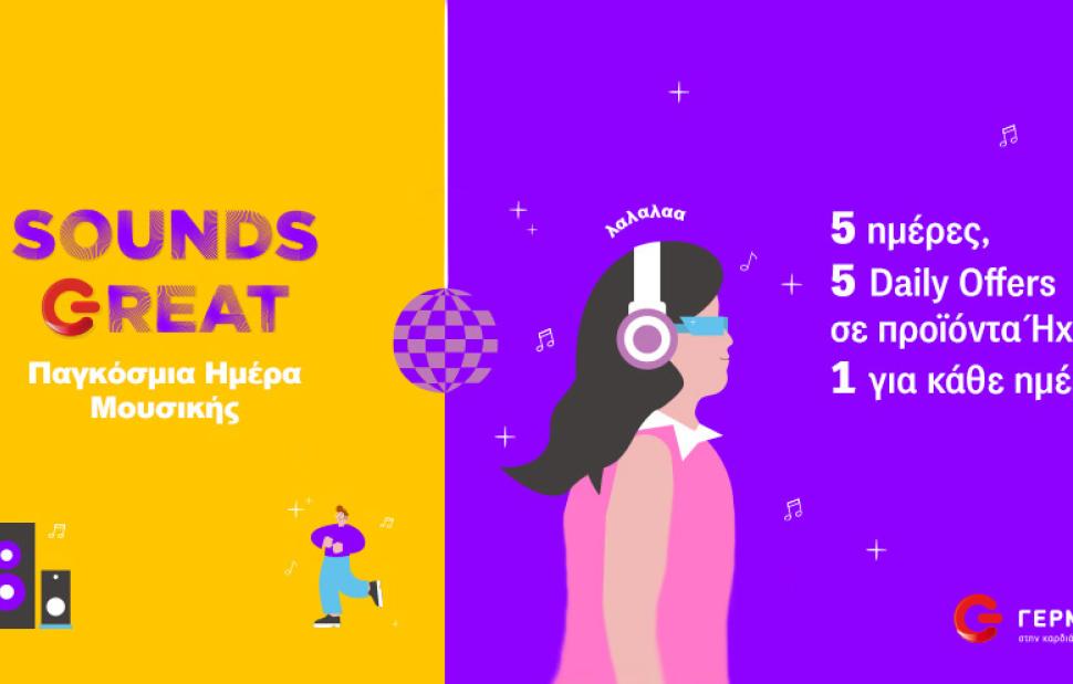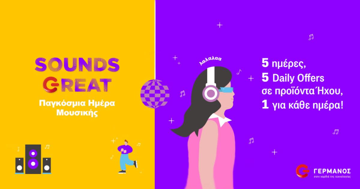 Πέντε μοναδικές προσφορές σε προϊόντα ήχου, η καθεμία από τις οποίες θα τρέξει για μία μόνο μέρα στο διάστημα 17-21 Ιουνίου, προσφέρουν στους λάτρεις της μουσικής τα καταστήματα ΓΕΡΜΑΝΟΣ σε όλη την Ελλάδα και το germanos.gr, με αφορμή την Παγκόσμια Ημέρα Μουσικής (21η Ιουνίου).