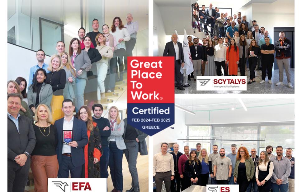 Οι εταιρίες του EFA GROUP, EFA VENTURES, SCYTALYS και ES SYSTEMS, που δραστηριοποιούνται στον τομέα της Αεροδιαστημικής, Ασφάλειας, Άμυνας και Βιομηχανικών Συνεργασιών, ανακοινώνουν ότι απέκτησαν, για 2η συνεχόμενη χρονιά, την Πιστοποίηση Great Place to Work®, μετά από αξιολόγηση που διενήργησε ο οργανισμός Great Place to Work® Hellas.