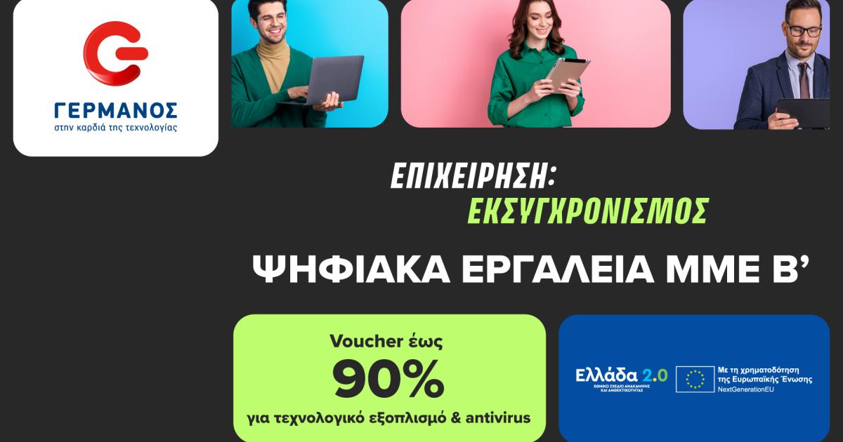 Την επιδότηση voucher έως 90% για αγορά νέου τεχνολογικού εξοπλισμού σε συνδυασμό με software μπορούν να εξαργυρώσουν στην COSMOTE και τον ΓΕΡΜΑΝΟ οι μικρομεσαίες επιχειρήσεις (ΜΜΕ) που συμμετέχουν στο πρόγραμμα «Ψηφιακά Εργαλεία ΜMΕ Β’», της Δράσης «Ψηφιακός Μετασχηματισμός Μικρομεσαίων Επιχειρήσεων».