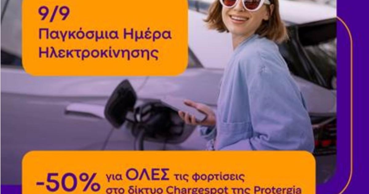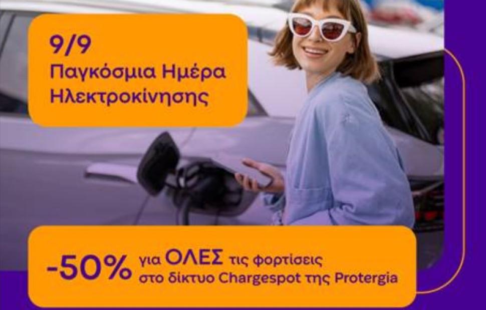 Η Protergia γιορτάζει την Παγκόσμια Ημέρα Ηλεκτροκίνησης στις 9 Σεπτεμβρίου και προσφέρει έκπτωση 50% στις χρεώσεις φόρτισης οχημάτων για όλη τη διάρκεια της ημέρας στο δίκτυο φορτιστών και ταχυφορτιστών της Chargespot.