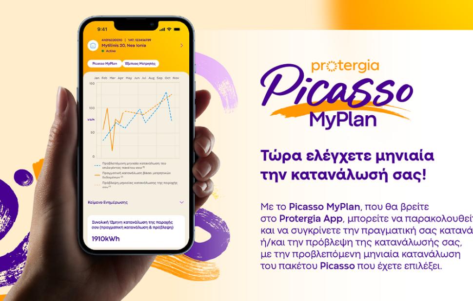 To Picasso MyPlan, που είναι διαθέσιμο στο Protergia App, φέρνει το Protergia Picasso ακόμη πιο κοντά στον καταναλωτή, κάνοντας την παρακολούθηση της κατανάλωσης εύκολη και άμεση. Με ένα απλό διάγραμμα, ο πελάτης συγκρίνει την πραγματική του κατανάλωση, όπως αποτυπώνεται από τα μετρητικά δεδομένα του ΔΕΔΔΗΕ ή και την πρόβλεψη της μηνιαίας κατανάλωσης της παροχής του, με την προβλεπόμενη κατανάλωση του πακέτου Picasso που έχει επιλέξει. Έτσι, βλέπει με μια ματιά αν το πακέτο του ανταποκρίνεται στις ανάγκες του. Το Picasso MyPlan λειτουργεί ως ένα πρακτικό εργαλείο ελέγχου, βοηθώντας τον πελάτη να παρακολουθεί έγκαιρα πώς κινείται η κατανάλωσή του μέσα στη χρονιά.