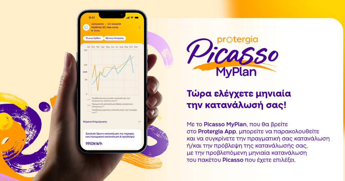 Με το Protergia Picasso και το νέο Picasso MyPlan, η ενέργεια γίνεται ακόμα πιο απλή και προβλέψιμη: από τη σταθερότητα του λογαριασμού έως τη συνεχή εικόνα της κατανάλωσης, ο πελάτης έχει τα εργαλεία που χρειάζεται για να αισθάνεται σιγουριά και έλεγχο. Η ενέργεια αλλάζει και γίνεται Protergia, τώρα με ακόμη μεγαλύτερη διαφάνεια και έλεγχο.