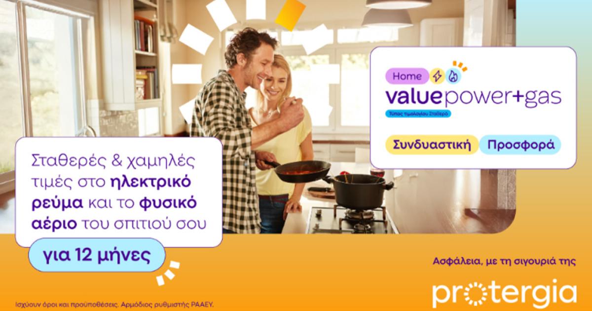 Η Protergia, η ενέργεια της METLEN Energy & Metals εξασφαλίζει σταθερότητα και οικονομία για ένα ολόκληρο έτος, με το Value Power+Gas, ένα ολοκληρωμένο πακέτο ρεύματος και φυσικού αερίου.