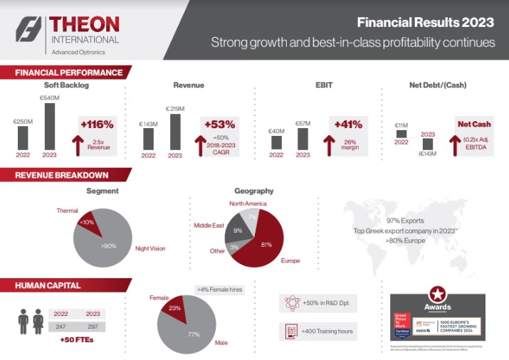Οπως σημειώνεται στην ανακοίνωση η THEON INTERNATIONAL PLC (THEON), κορυφαίος κατασκευαστής συστημάτων νυχτερινής όρασης και θερμικής απεικόνισης για αμυντικές εφαρμογές και εφαρμογές ασφαλείας με παγκόσμιο αποτύπωμα, ανακοινώνει σήμερα τα οικονομικά της αποτελέσματα για το σύνολο του έτους 2023. Επιδεικνύοντας ανθεκτικότητα, προσαρμοστικότητα και δέσμευση στην καινοτομία, η THEON σημείωσε μεγάλη επιτυχία, ξεπερνώντας τις προσδοκίες και θέτοντας νέα σημεία αναφοράς στον κλάδο.