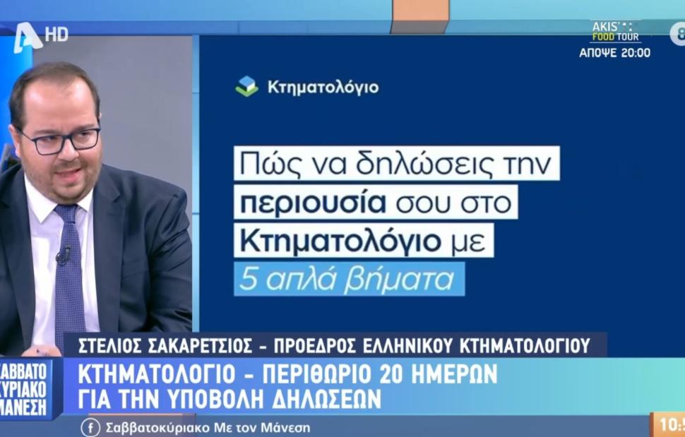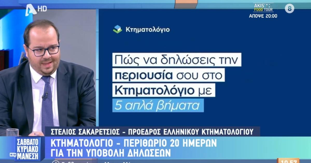 Με την προθεσμία υποβολής δηλώσεων ιδιοκτησίας να λήγει στις 30 Νοεμβρίου, ο Πρόεδρος του Ελληνικού Κτηματολογίου, Στέλιος Σακαρέτσιος, μίλησε το Σάββατο στον Alpha και στον Νίκο Μάνεση, καλώντας τους πολίτες να συμμετέχουν στην τελική φάση αυτού του εμβληματικού έργου για να θωρακίσουν τις περιουσίες τους.