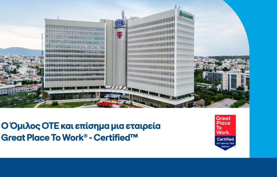 Ο Όμιλος ΟΤΕ έλαβε την πιστοποίηση Great Place To Work®, μια σημαντική τιμητική διάκριση που αναγνωρίζει την κουλτούρα του εργασιακού περιβάλλοντος. Η πιστοποίηση είναι αποτέλεσμα της ανεξάρτητης και ανώνυμης έρευνας του Great Place To Work Hellas, παγκόσμιου ηγέτη στην κουλτούρα του χώρου εργασίας, στην οποία συμμετείχαν οι εργαζόμενοι του Ομίλου.