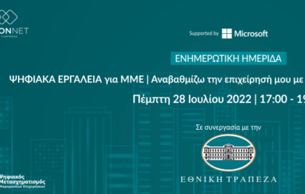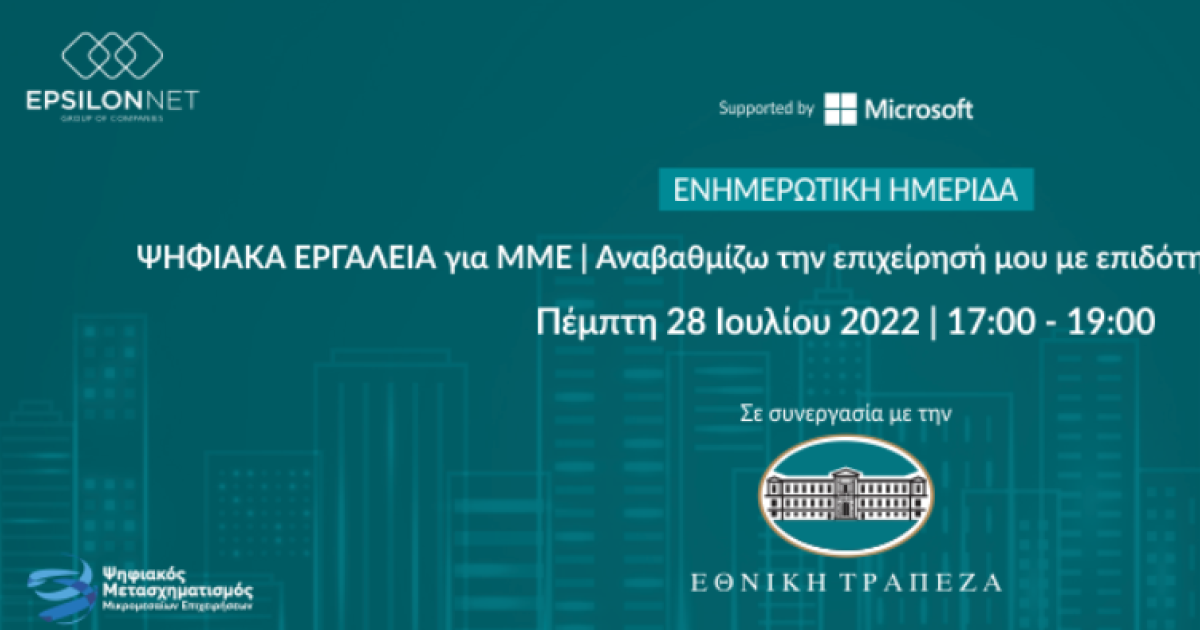 Ο Όμιλος Epsilon Net, «Εγκεκριμένος Προμηθευτής» για τα προγράμματα «Ψηφιακά Εργαλεία MME», με στόχο την ολοκληρωμένη ενημέρωση για τις δυνατότητες ενίσχυσης του ψηφιακού μετασχηματισμού των ελληνικών επιχειρήσεων από το Ταμείο Ανάκαμψης, συνδιοργανώνει αύριο, Πέμπτη 28 Ιουλίου 2022 (17:00 – 19:00), μαζί με την Info Quest Technologies ενημερωτική ημερίδα με τη συνεργασία της Εθνικής Τράπεζας και την υποστήριξη της Microsoft, με τίτλο: « ΨΗΦΙΑΚΑ ΕΡΓΑΛΕΙΑ για ΜΜΕ. Αναβαθμίζω την επιχείρησή μου με επιδότηση 90% με VOUCHER».