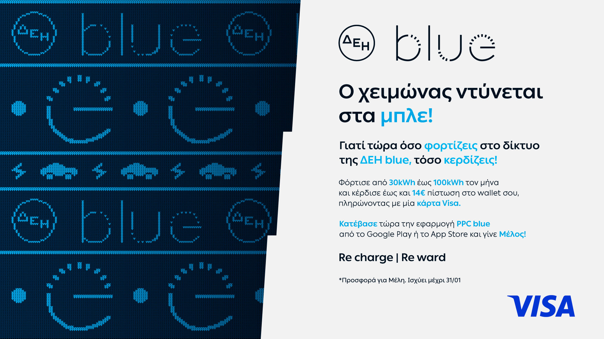 Η ΔΕΗ blue με το πρόγραμμα Re charge | Re ward και σε συνεργασία με τη Visa συνεχίζουν για 2η χρονιά την προώθηση των βιώσιμων μετακινήσεων, προσφέροντας στους οδηγούς ηλεκτρικών οχημάτων σημαντικά προνόμια.