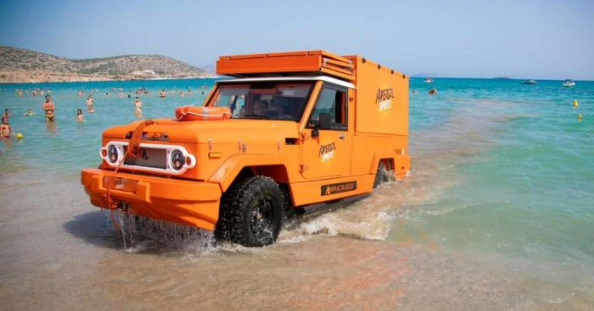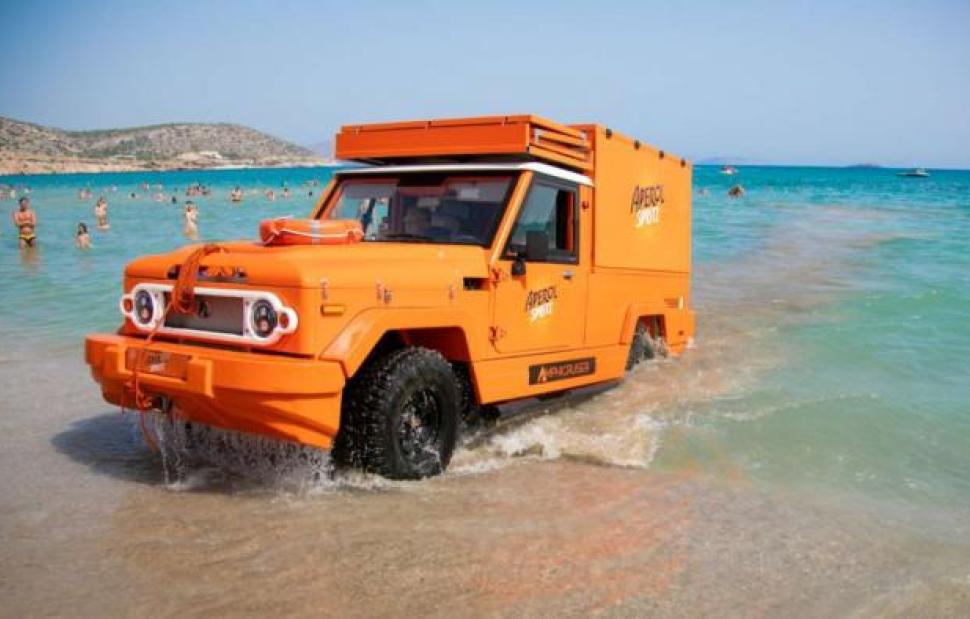 Αξίζει να σημειωθεί ότι το πορτοκαλί όχημα, που… αισθάνεται εξίσου άνετα σε στεριά και θάλασσα ανήκει σε γνωστή εταιρεία παραγωγής αλκοολούχων ποτών η οποία διοργανώνει πληθώρα events σε νησιά της χώρας μας.