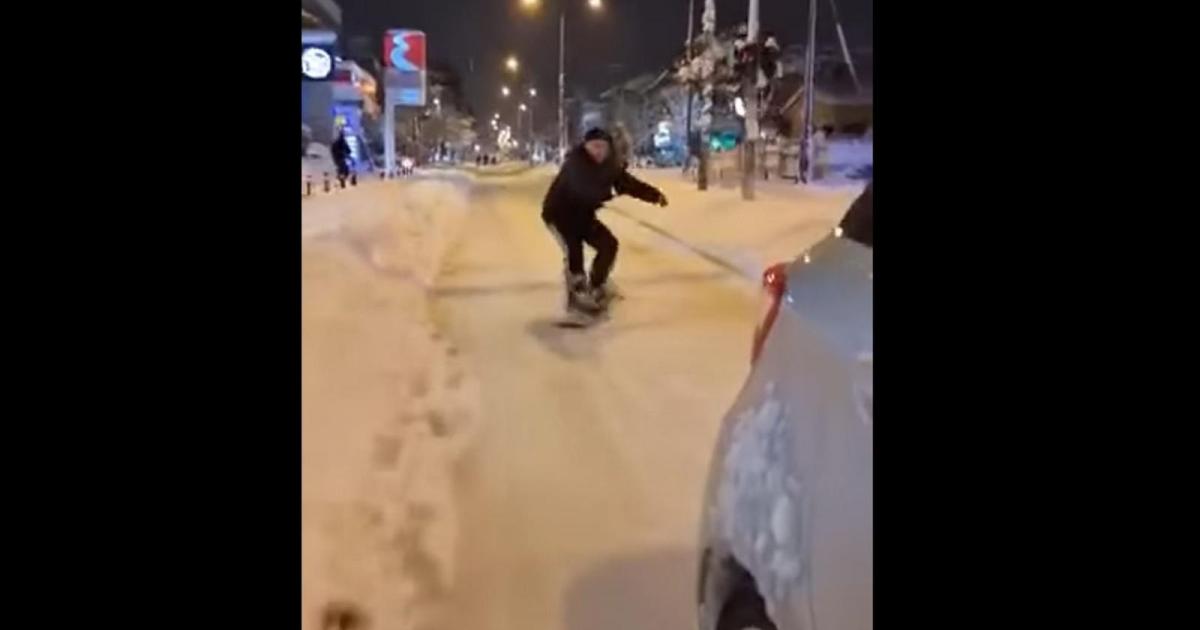 Όπως θα δείτε και στο βίντεο, η διαδρομή που έκαναν στην κεντρική λεωφόρο δεν είναι μικρή, με τον snowboarder να επιδίδεται σε κόλπα και φιγούρες εντυπωσιασμού δίπλα από αυτοκίνητα. Μάλιστα, κάποιος επιβάτης ενθαρρύνει τον ατρόμητο snowboarder, με τον τελευταίο να ζητά να ανεβάσουν και άλλο ταχύτητα κίνησης.