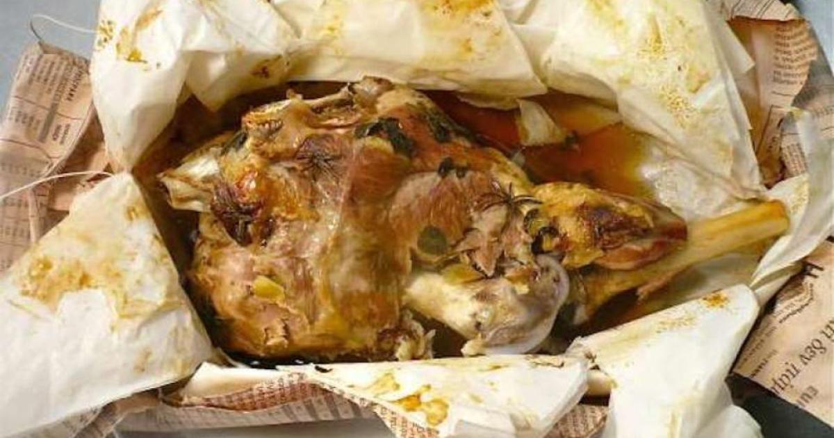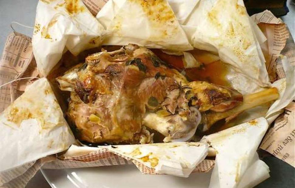 Τυλίγουμε το πακετάκι που έχουμε και με ένα ακόμα φύλλο λαδόκολλας, για περισσότερη ενίσχυση, τοποθετούμε τη λαμαρίνα με το πακέτο σε προθερμασμένο φούρνο στους 200 βαθμούς για μία ώρα περίπου και στη συνέχεια στους 180 για μιάμιση με δύο ώρες ακόμα (εξαρτάται από τον φούρνο). Μόλις ψηθεί το κρέας, το αφήνουμε για περίπου ένα μισάωρο μέσα στο πακέτο του να ξεκουραστεί και στη συνέχεια το σερβίρουμε σε πιατέλα.