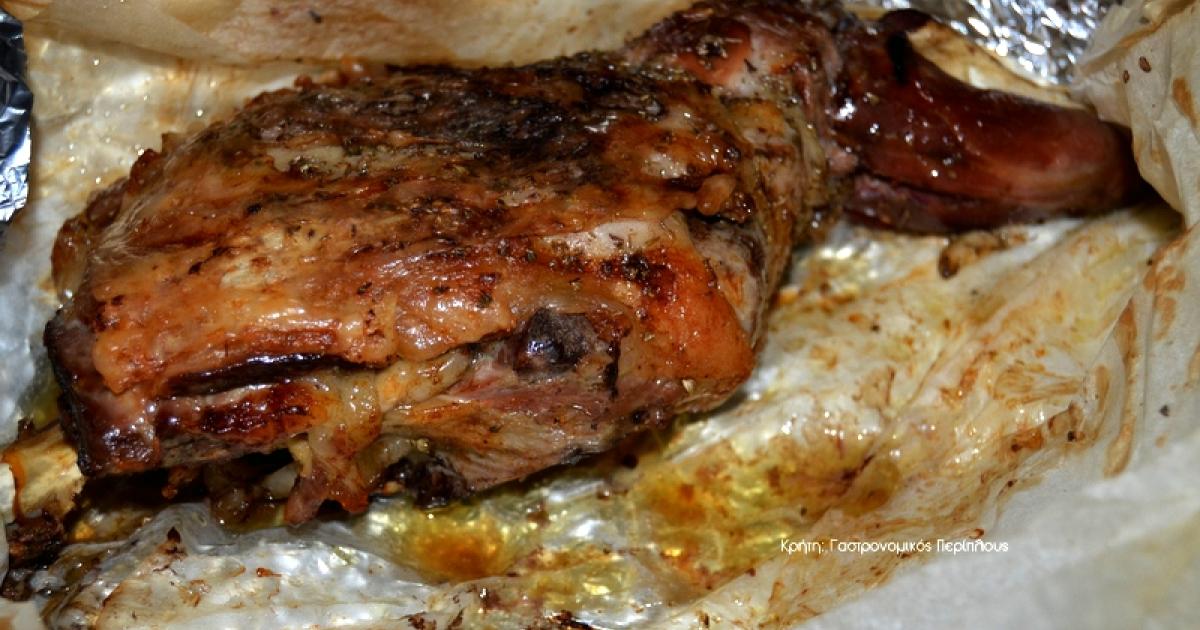 Τυλίγουμε το πακετάκι που έχουμε και με ένα ακόμα φύλλο λαδόκολλας, για περισσότερη ενίσχυση, τοποθετούμε τη λαμαρίνα με το πακέτο σε προθερμασμένο φούρνο στους 200 βαθμούς για μία ώρα περίπου και στη συνέχεια στους 180 για μιάμιση με δύο ώρες ακόμα (εξαρτάται από τον φούρνο). Μόλις ψηθεί το κρέας, το αφήνουμε για περίπου ένα μισάωρο μέσα στο πακέτο του να ξεκουραστεί και στη συνέχεια το σερβίρουμε σε πιατέλα.