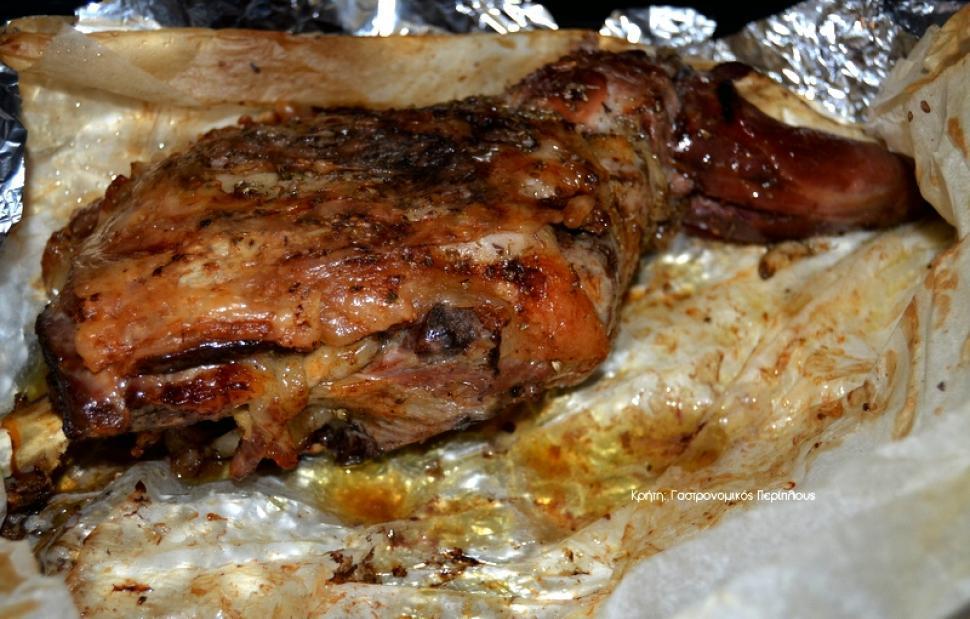 Τυλίγουμε το πακετάκι που έχουμε και με ένα ακόμα φύλλο λαδόκολλας, για περισσότερη ενίσχυση, τοποθετούμε τη λαμαρίνα με το πακέτο σε προθερμασμένο φούρνο στους 200 βαθμούς για μία ώρα περίπου και στη συνέχεια στους 180 για μιάμιση με δύο ώρες ακόμα (εξαρτάται από τον φούρνο). Μόλις ψηθεί το κρέας, το αφήνουμε για περίπου ένα μισάωρο μέσα στο πακέτο του να ξεκουραστεί και στη συνέχεια το σερβίρουμε σε πιατέλα.