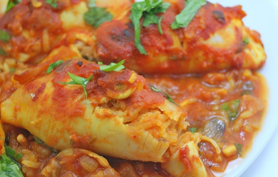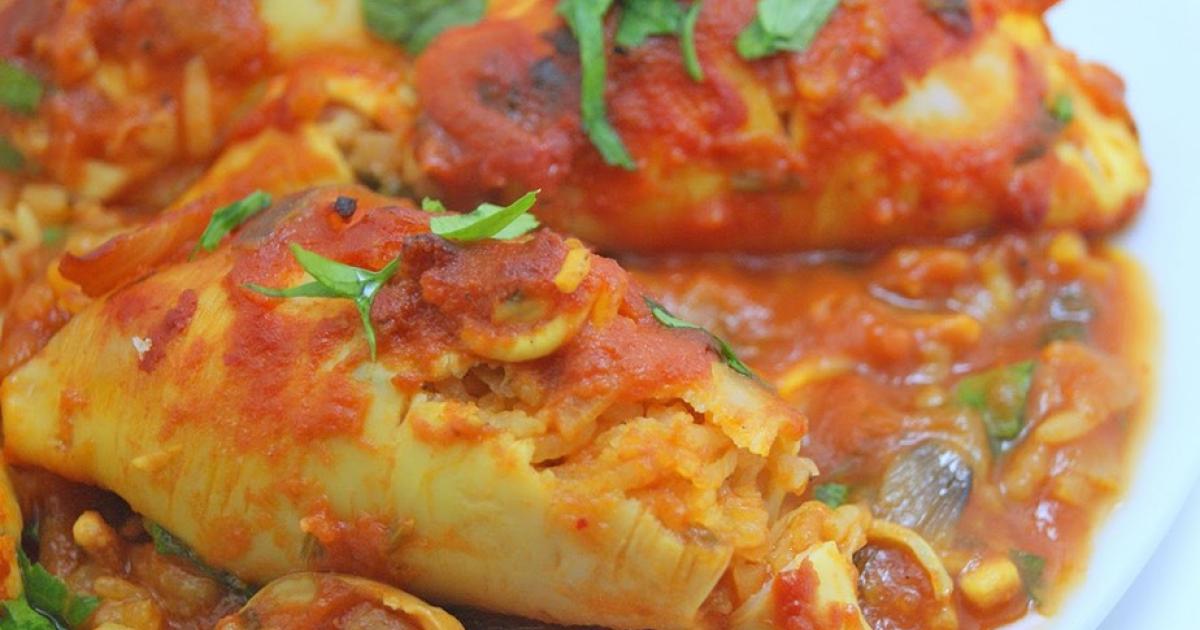 3. Σε άλλη κατσαρόλα, τσιγαρίζουμε τα καλαμάρια για λίγο. Τα βγάζουμε, τα αφήνουμε να κρυώσουν, τα γεμίζουμε προσεκτικά με το μείγμα που έχουμε ετοιμάσει και τα κλείνουμε καλά με μια οδοντογλυφίδα.