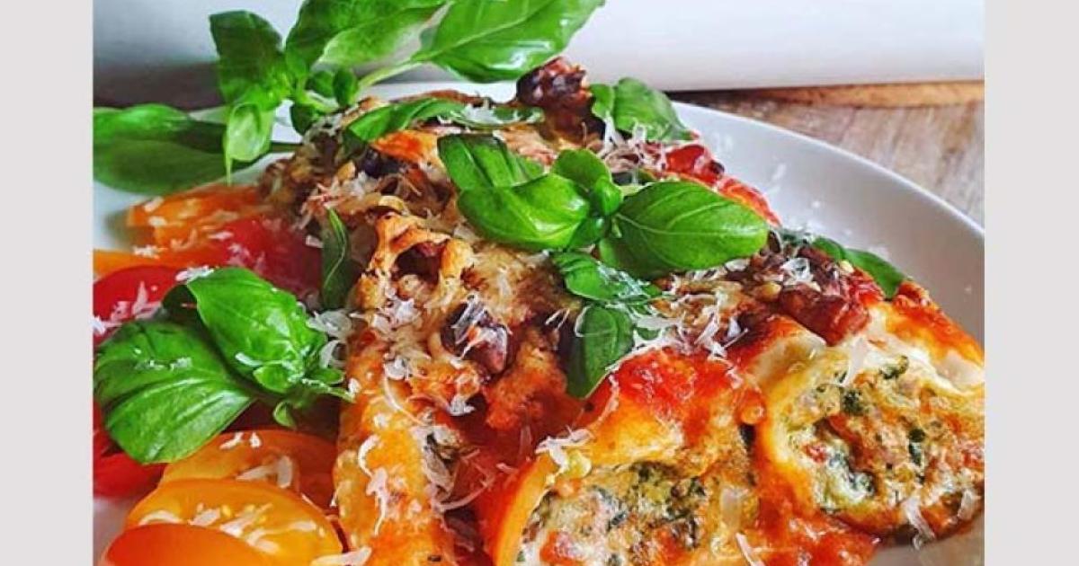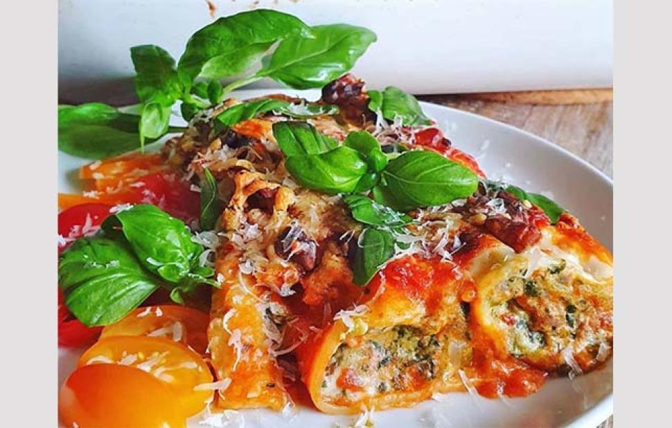 2. Προθερμαίνουμε το φούρνο στους 180 βαθμούς, κάτω με αέρα. Ετοιμάζουμε το πιρέξ: Βάζουμε το ελαιόλαδο και τα υπόλοιπα υλικά εκτός από το τριμμένο τυρί. Γεμίζουμε στη συνέχεια με κουταλάκι τα κανελόνια, με τη γέμιση που έχουμε ετοιμάσει και τα τοποθετούμε με προσοχή στο σκεύος, στη σειρά, το ένα δίπλα στο άλλο (το γέμισμα είναι ίσως το δυσκολότερο και για αυτό η σάλτσα δεν θα πρέπει να είναι πολύ αραιή).