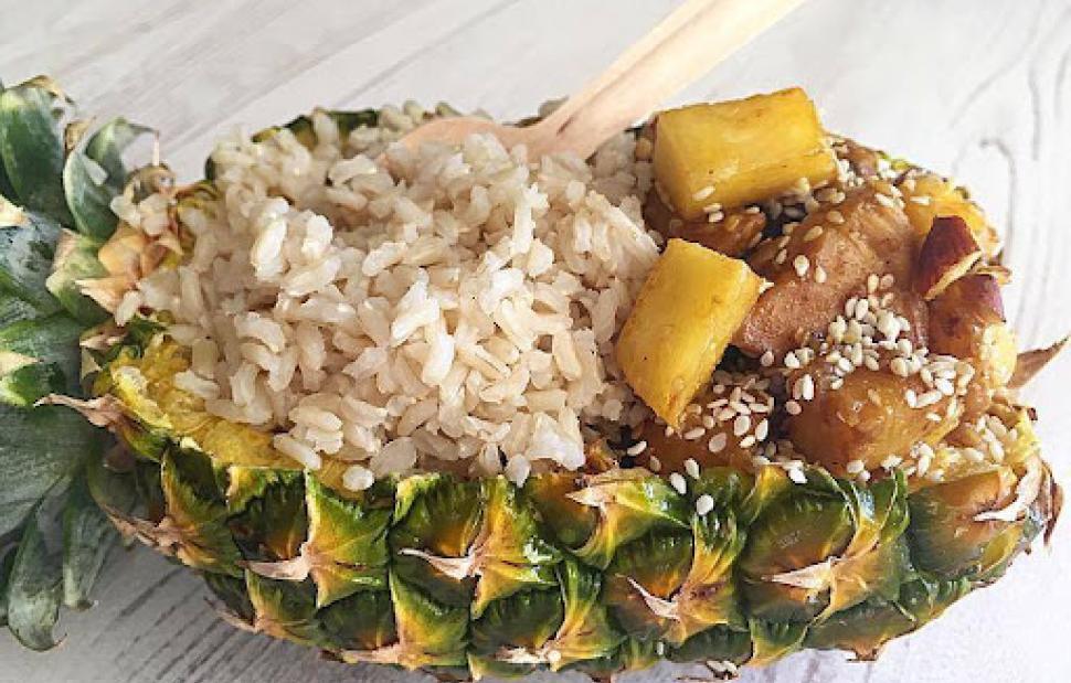 1. Σοτάρουμε σε ελαιόλαδο, δύο μέτρια κρεμμύδια, ψιλοκομμένα. Όταν χρυσίσουν, προσθέτουμε το κοτόπουλο να τσιγαριστεί σε όλες τις επιφάνειες του. Ρίχνουμε μετά το ένα φακελάκι κάρυ, για να βγάλει τα αρώματα του. Προσθέτουμε το γάλα καρύδας (ένα κουτάκι που βρίσκουμε στα σούπερ μάρκετ) και λίγο από το ζουμί που έχει η κονσέρβα με τον ανανά. Αφήνουμε το φαγητό να σιγομαγειρευτεί.