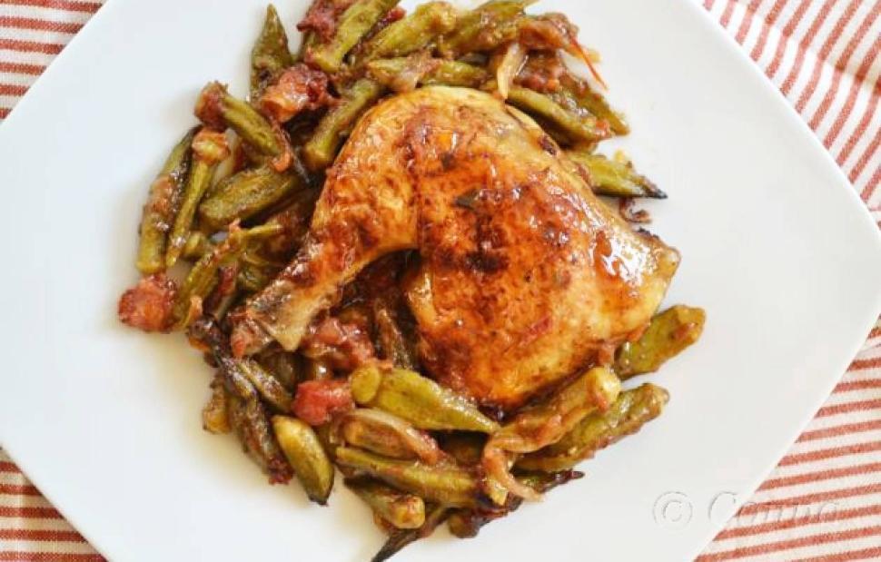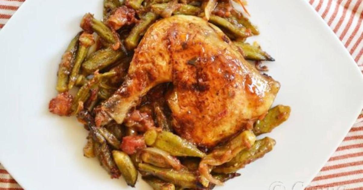 1. Σε τηγάνι, βάζουμε 3–4 κουταλιές σούπας ελαιόλαδο, αφήνουμε να ζεσταθεί, ρίχνουμε τις μπάμιες, αλατίζουμε και σοτάρουμε για 2-3 λεπτά. Σβήνουμε με 2-3 κουταλιές σούπας ξίδι και το αφήνουμε να εξατμιστεί. Σε γάστρα, βάζουμε το κοτόπουλο στη μία πλευρά και τις σοταρισμένες μπάμιες από την άλλη.