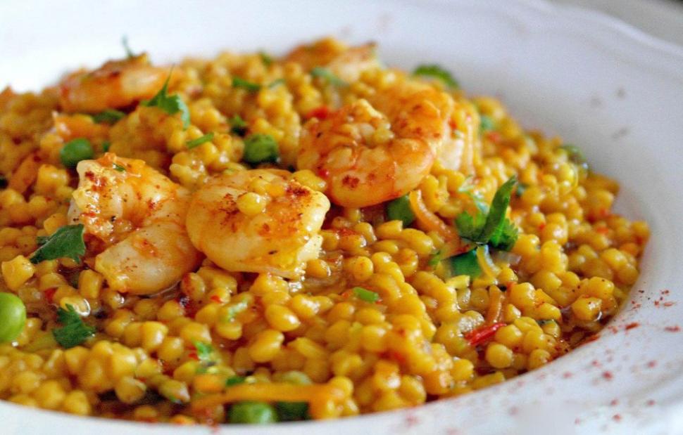 Βγάζουμε μετά το τηγάνι από την φωτιά, ρίχνουμε το χυμό λεμονιού, το μπούκοβο, το μαϊντανό και σερβίρουμε τις γαρίδες με το κουσκούς.