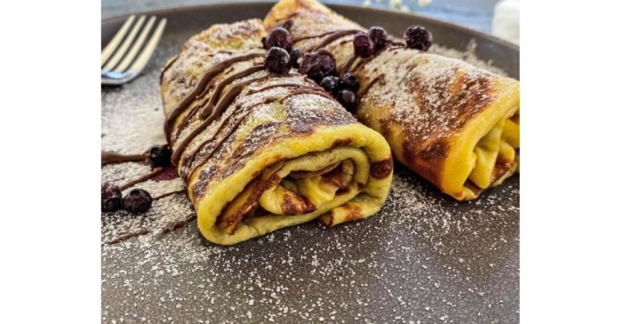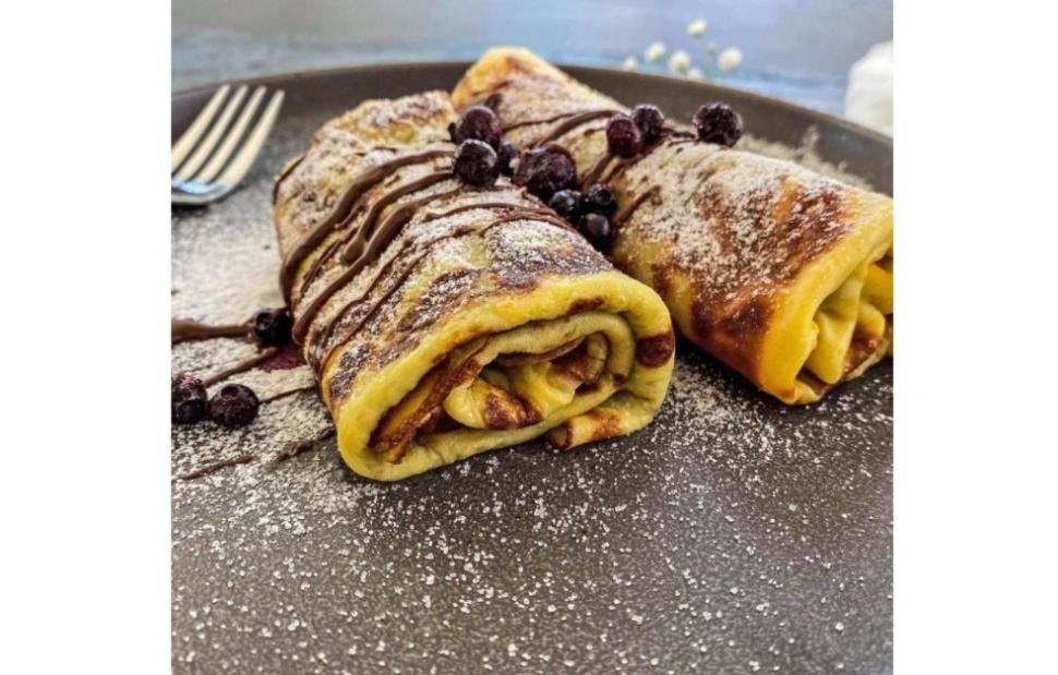 Περιμένουμε μέχρι να ξεκολλάει η κρέπα από το σκεύος και τη γυρίζουμε και από την άλλη μεριά. Γεμίζουμε την κρέπα με ποσότητα πραλίνας φουντουκιού από τη πλευρά που δεν έχει το σχέδιο.