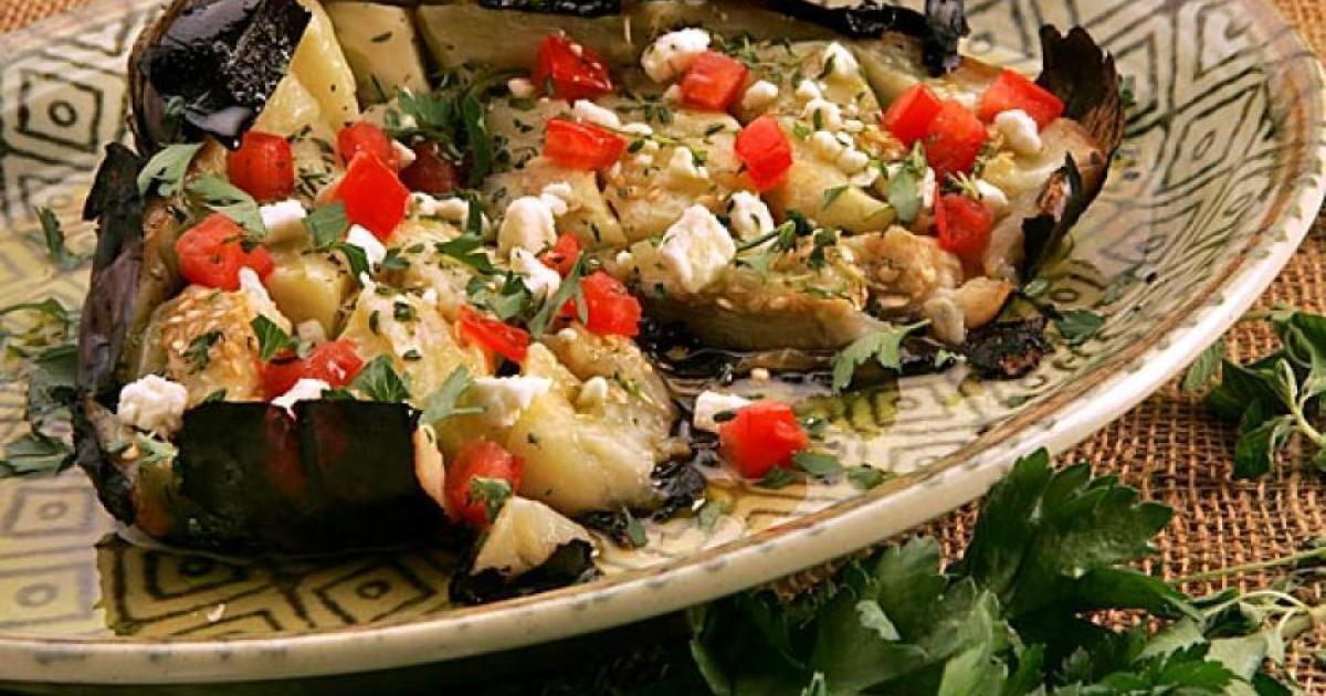 Όταν τις βγάλουμε από το φούρνο, τις σκεπάζουμε με σακούλα και τις αφήνουμε να κρυώσουν για μία ώρα, ξεφλουδίζοντας τις στη συνέχεια. Κατόπιν, τις χωρίζουμε με το χέρι σε μεγάλα κομμάτια, κάθετα και τις βάζουμε σε τάπερ. Εκεί, προσθέτουμε τα υπόλοιπα υλικά και ανακατεύουμε.