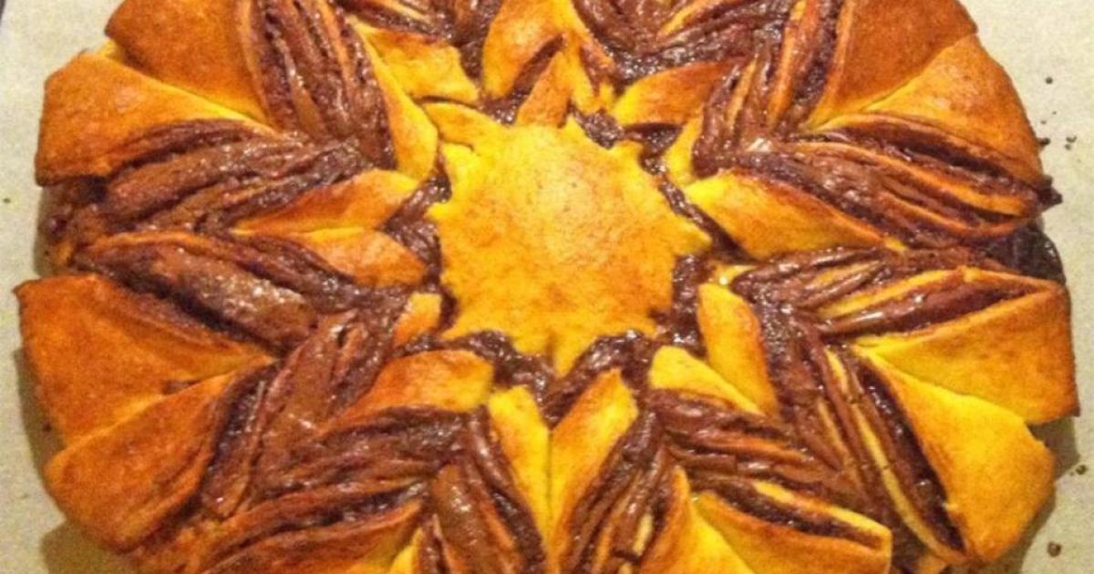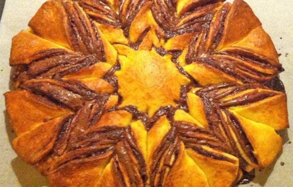 Αφού το αλείψω -χρησιμοποιώντας πινελάκι- με κρόκο αυγού, κόβω το γλυκό σε λωρίδες διαστάσεων 3-4 εκατοστών από το κέντρο προς τα έξω, διατηρώντας όμως ανέγγιχτο τον πυρήνα του ψωμιού. Έπειτα, στρίβω κάθε λωρίδα σε αντίθετη φορά από την προηγούμενη και αφήνω το γλυκό και πάλι στην άκρη για να φουσκώσει.