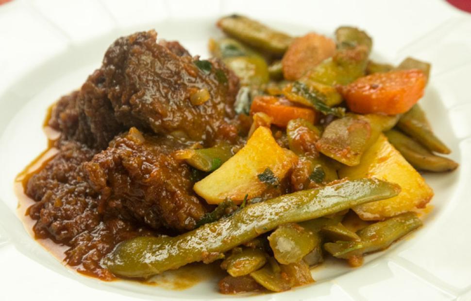 Προσθέτουμε έπειτα το κρεμμύδι και το σκόρδο, καλά τριμμένα, ανακατεύουμε για 1 με 2 λεπτά και στη συνέχεια προσθέτουμε τις ντομάτες και ένα φλιτζάνι ζεστό νερό. Αφήνουμε το φαγητό να βράσει και να μαλακώσει αρκετά το κρέας, για περίπου 45 λεπτά.