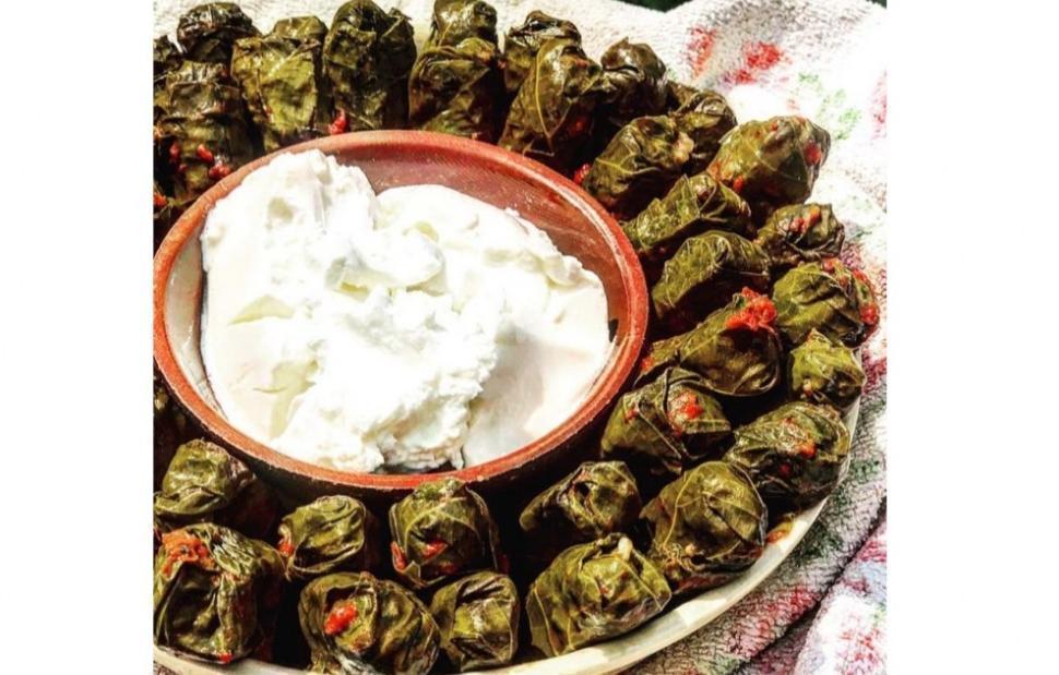 2. Αν έχουμε αμπελόφυλλα από κονσέρβα ή γυάλα, τα ξεπλένουμε καλά με νερό για να φύγει η αλμύρα και τα αφήνουμε να στραγγίξουν. Τα απλώνουμε έπειτα ένα-ένα με το γυαλιστερό μέρος από κάτω και βάζουμε στο κέντρο τους ένα κουταλάκι του γλυκού από τη γέμιση. Διπλώνουμε τις δύο άκρες προς τα μέσα και στη συνέχεια τυλίγουμε το ντολμαδάκι σαν πούρο.