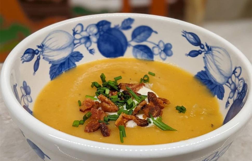 Όταν η σούπα είναι έτοιμη (οι πατάτες και τα καρότα, καλά βρασμένα) και έχουμε σβήσει το μάτι της κουζίνας, παίρνουμε το ραβδομπλέντερ και αλέθουμε τη σούπα. Στο τέλος πρέπει να έχει μια ωραία υφή. Αν είναι πολύ πηκτή βάζουμε λιγάκι νερό, δοκιμάζουμε και προσθέτουμε τα 100 ml κρέμα γάλακτος.