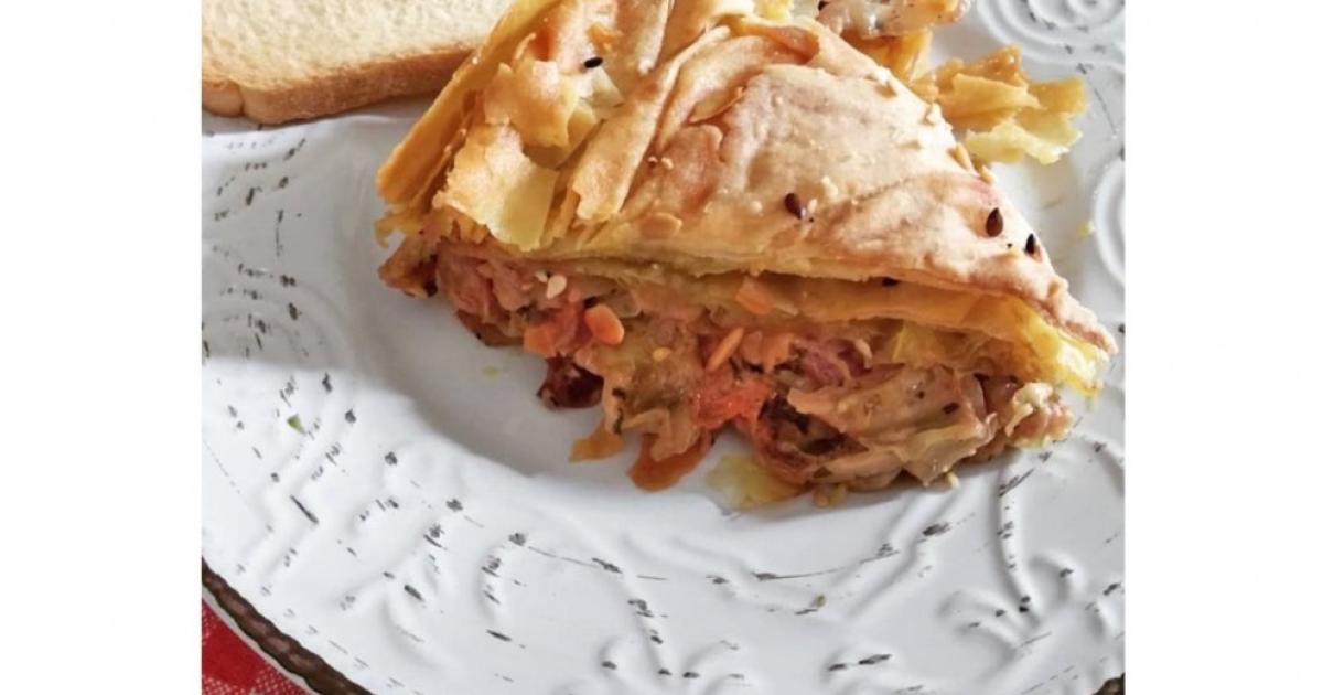 Κατόπιν, απλώνουμε σε ταψί το ένα φύλλο σφολιάτα αδειάζουμε τη γέμιση, σκεπάζουμε με το άλλο φύλλο, χαράζουμε την πίτα και την ψήνουμε στους 180 βαθμούς, στον αέρα, για περίπου μισή ώρα ή έως ότου να ροδίσει το φύλλο.