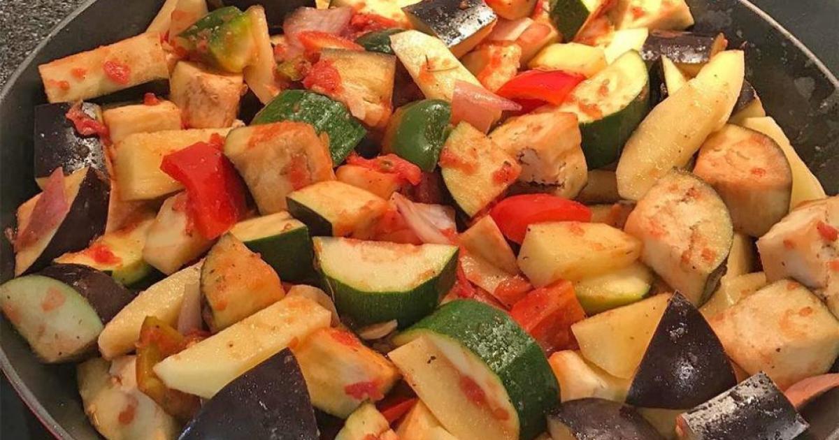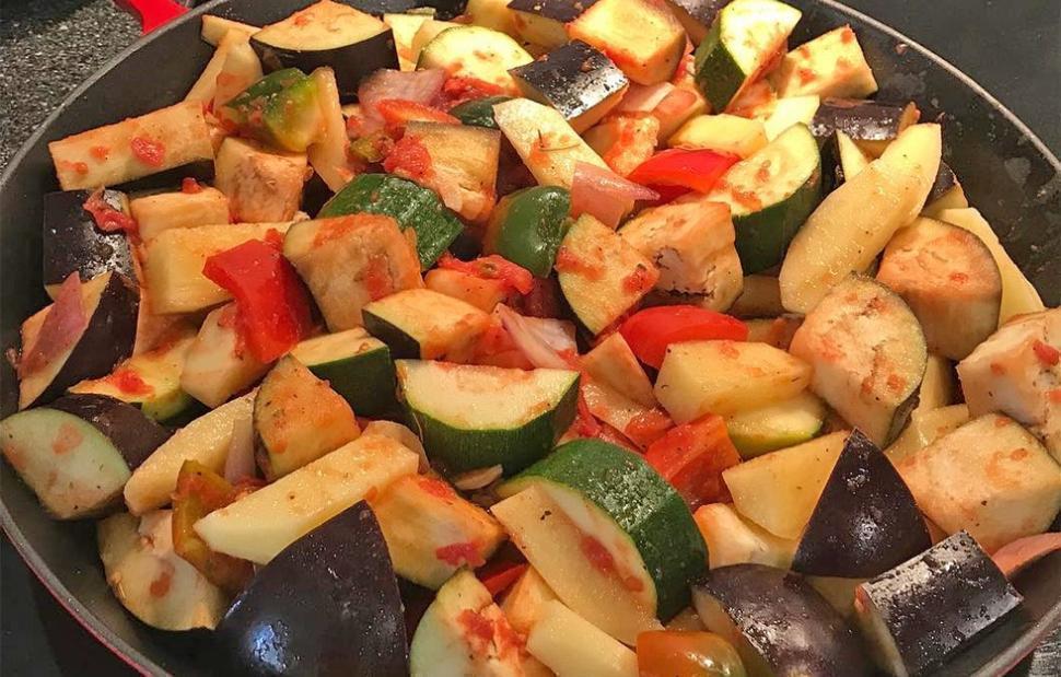 3. Σε βαθύ τηγάνι με καπάκι, ρίχνουμε λίγο ελαιόλαδο και απλώνουμε το 1/3 της τριμμένης ντομάτας μαζί με τα υγρά της. Προσθέτουμε από πάνω σε στρώσεις τις πατάτες, λίγη ακόμα ντομάτα, λίγο σοταρισμένο κρεμμύδι, μυρωδικά (από λίγα), πιπέρι, τα καρότα, τα κολοκυθάκια, τις πιπεριές, το υπόλοιπο κρεμμύδι, μυρωδικά (από λίγα) και τις μελιτζάνες.