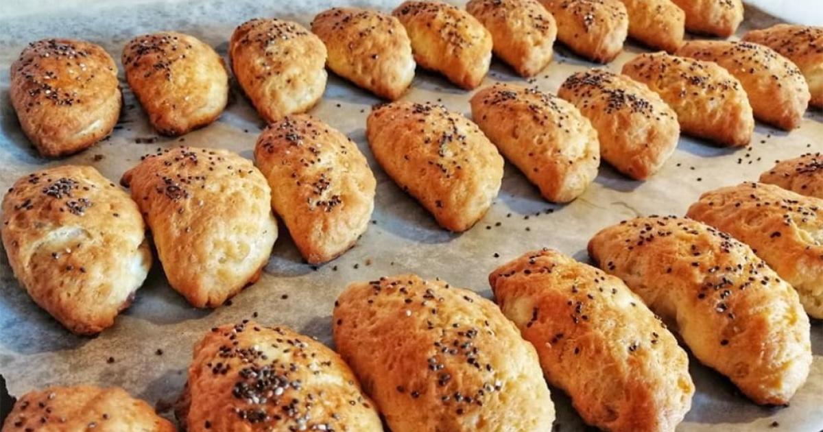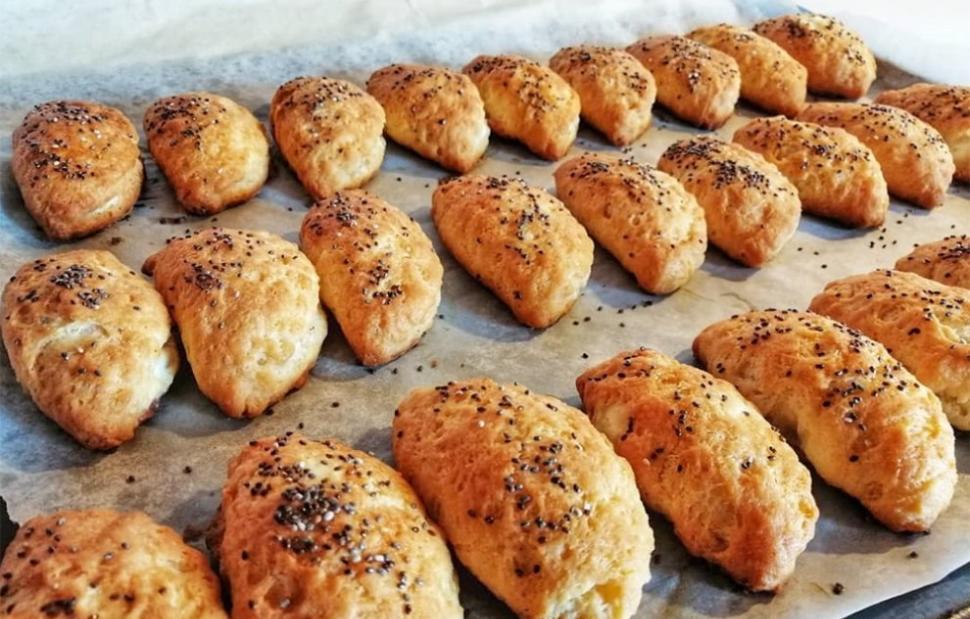 - Αφού φτιάξουμε τη ζύμη, την απλώνουμε σε καθαρή επιφάνεια εργασίας με τον πλάστη και την κόβουμε σε στρογγυλά σχήματα χρησιμοποιώντας είτε το στόμιο ενός ποτηριού είτε κουπ πατ. Κάθε στρογγυλό κομμάτι ζύμης το γεμίζουμε με μικρή ποσότητα από τη γέμιση, τη σκεπάζουμε καλά με τη ζύμη, φτιάχνοντας μισοφέγγαρα (πιρουνιάζουμε τα σημεία που ενώνονται οι δύο πλευρές της ζύμης για να μη χυθεί η γέμιση) τα οποία τοποθετούμε σε λαδωμένο ταψάκι.