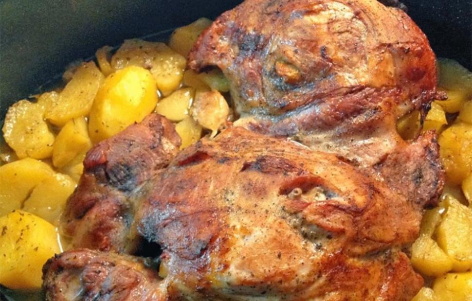 Κλείνουμε το καπάκι και ψήνουμε στο φούρνο τη σπάλα, στους 180 βαθμούς, για 4-5 ώρες. Προς το τέλος, βγάζουμε το καπάκι και αφήνουμε το κρέας να πάρει χρώμα. Συνοδεύουμε με πατάτες ή ρύζι.