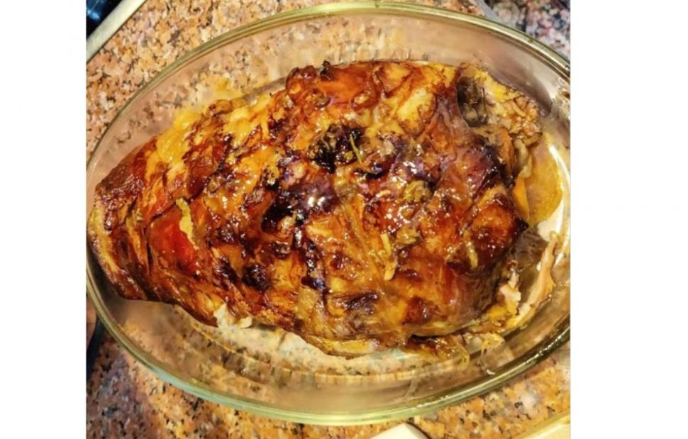 Τυλίγουμε με αλουμινόχαρτο και ψήνουμε στους 180 βαθμούς για τρεις περίπου ώρες. Κατά διαστήματα περιχύνουμε το κρέας με το ζουμί του από το ταψί και στο τέλος αφαιρούμε το αλουμινόχαρτο για να ροδίσει στην επιφάνεια του.