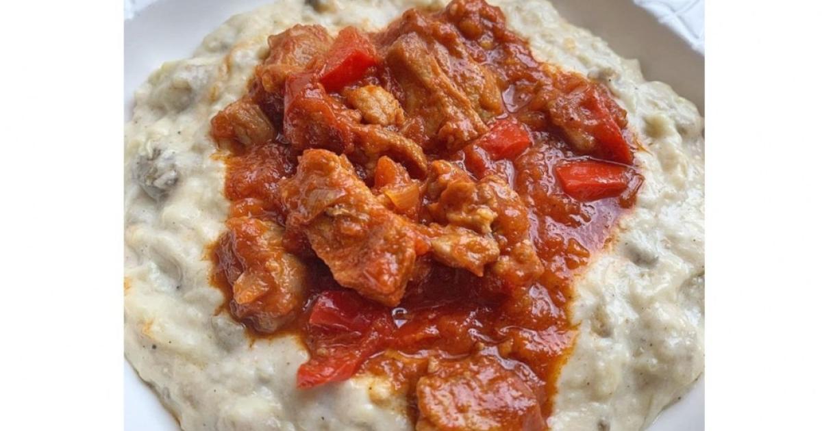 Όταν είναι έτοιμη, την αποσύρουμε και προσθέτουμε τον πουρέ μελιτζάνας, ανακατεύοντας καλά. Σερβίρουμε σε πιάτο τον πουρέ μελιτζάνας και πάνω βάζουμε το κρέας με τη δεμένη σάλτσα του.