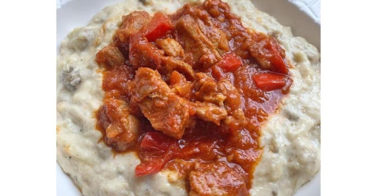 Όταν είναι έτοιμη, την αποσύρουμε και προσθέτουμε τον πουρέ μελιτζάνας, ανακατεύοντας καλά. Σερβίρουμε σε πιάτο τον πουρέ μελιτζάνας και πάνω βάζουμε το κρέας με τη δεμένη σάλτσα του.