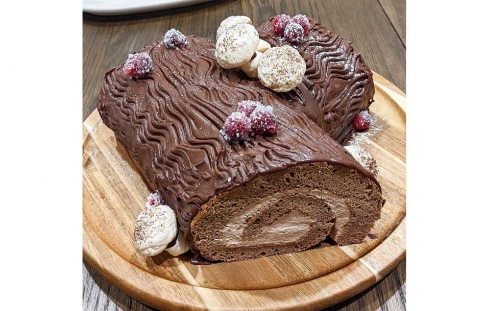 5. Ανοίξτε το ρολό και στρώστε πάνω την κρέμα με σπάτουλα. Αρχίστε να τυλίγετε από την αντίθετη πλευρά που είχατε ξεκινήσει όταν το βγάλατε από τον φούρνο. Μη στεναχωρηθείτε αν δείτε να σας βγαίνει λίγη κρέμα από τον κορμό. Κόψτε κατευθείαν δύο κομματάκια από το κούτσουρο σας για τα παρακλάδια του κορμού. Μεταφέρετέ τον στον δίσκο που θα τον διακοσμήσετε (σηκώστε τον με πετσέτα, είναι πιο εύκολο).