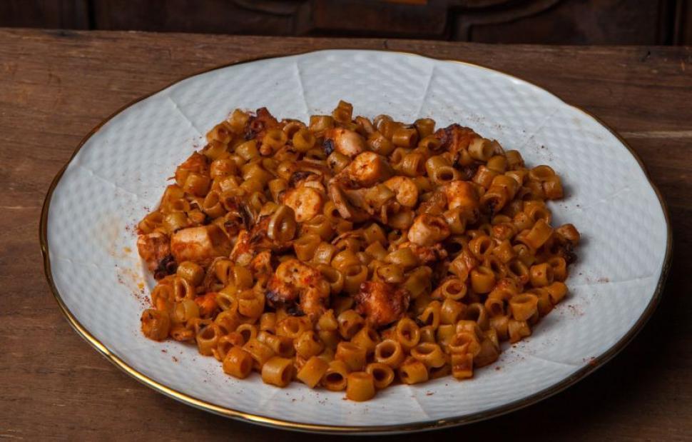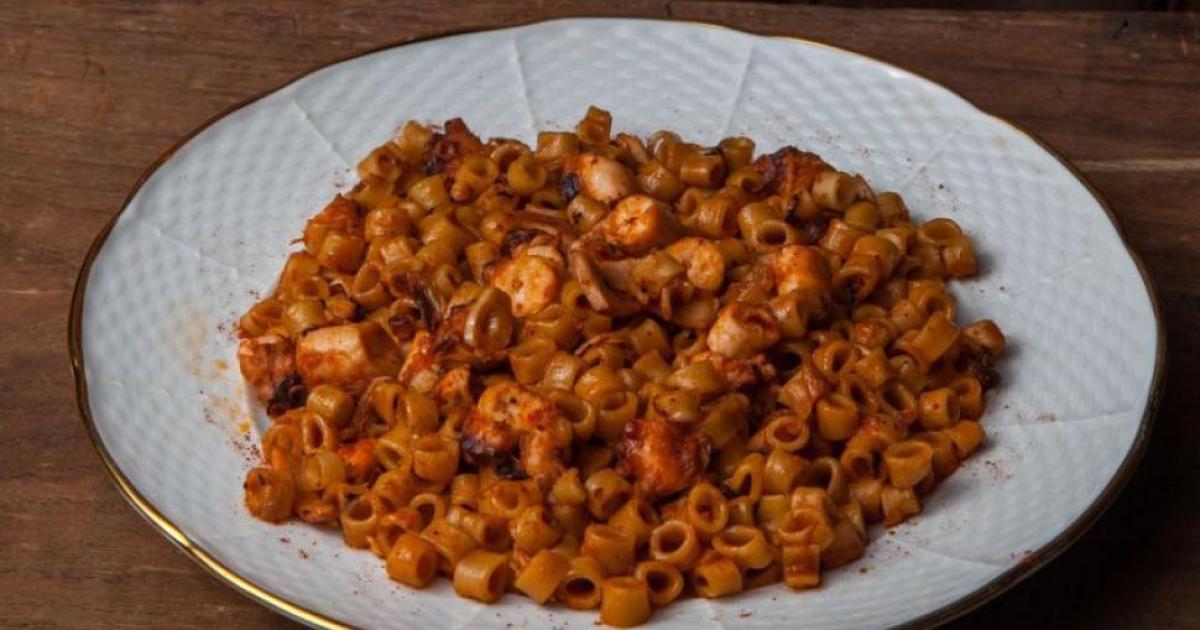 Όταν πλέον είναι έτοιμο, προσθέτουμε τις ντομάτες, αφού τις έχουμε περάσει από το μούλτι, ρίχνουμε τη ζάχαρη, αλατοπιπερώνουμε και προσθέτουμε και την κανέλα. Όταν βράσει το χταπόδι και έχει αρχίσει ήδη να μαλακώνει, προσθέτουμε πέντε ποτήρια ζεστό νερό και μετά τα ζυμαρικά. Μαγειρεύουμε για 25 με 30 λεπτά και όταν το φαγητό μείνει μόνο με τη σάλτσα του, το σερβίρουμε ζεστό.