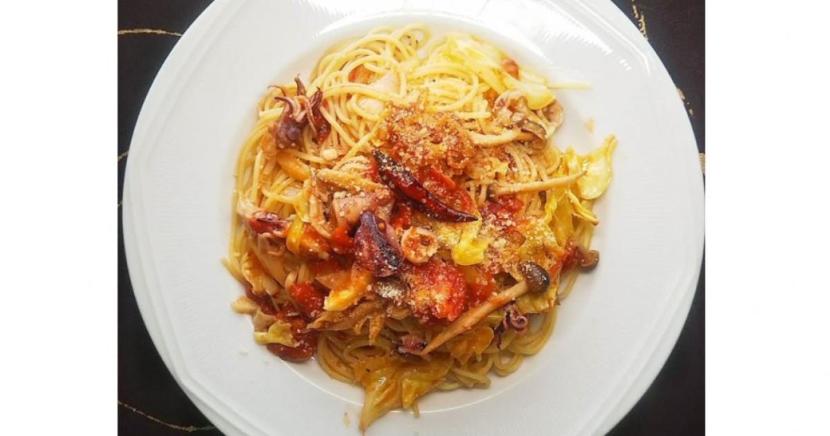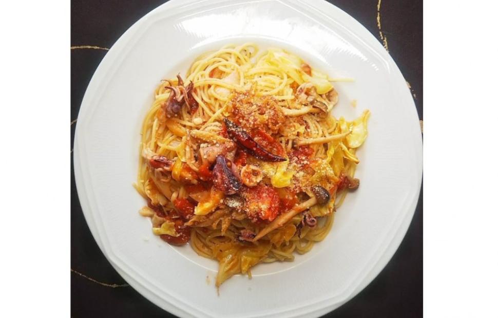 3. Βράζετε τα ζυμαρικά σε αλατισμένο νερό. Τα στραγγίζετε και τα ανακατεύετε, προσθέτοντας 1 κουταλάκι του γλυκού φρέσκο ψιλοκομμένο δυόσμο. Βάζετε τα καλαμάρια και λίγη από την σάλτσα σε πήλινο σκεύος, στο κέντρο και τα μακαρόνια γύρω- γύρω.