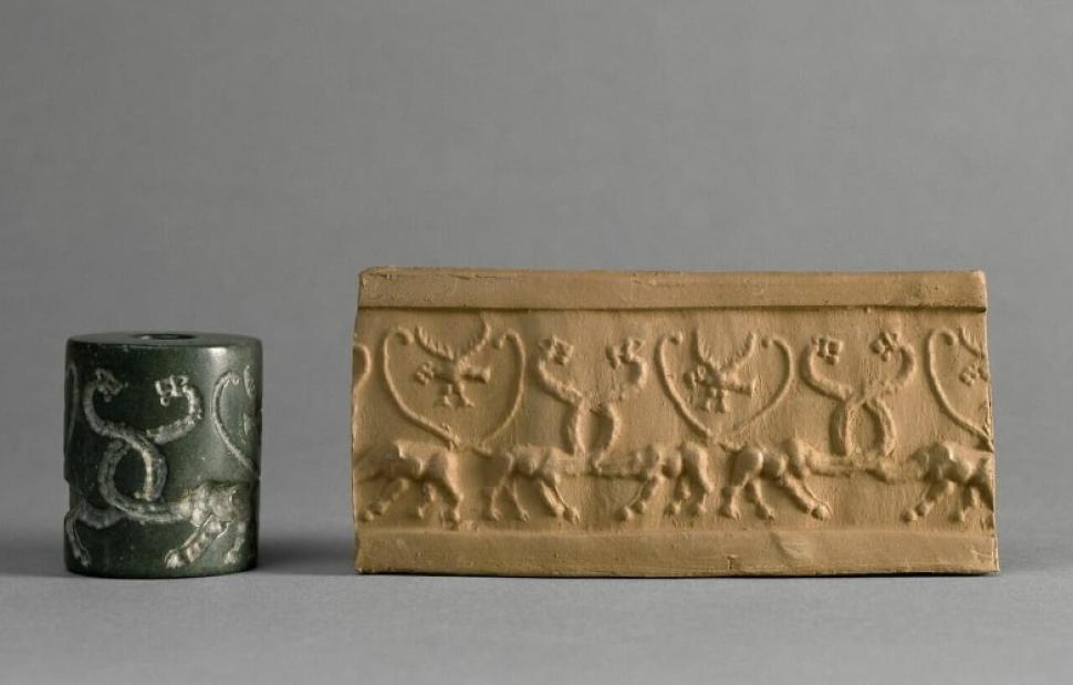 Οι κυλινδρικές σφραγίδες ήταν μικρά αντικείμενα από πέτρα με περίτεχνα λαξεύματα, που περιέβαλαν τις πήλινες επιγραφές, προκειμένου ν’ αφήνουν το αποτύπωμά τους. Αρχικά, χρησιμοποιούνταν κυρίως για διοικητικούς σκοπούς, σε μια κοινωνία που γινόταν ολοένα και πιο περίπλοκη, ωθούμενη από την ανάπτυξη του εμπορίου, την αγροτική παραγωγή και την παραγωγή της κλωστοϋφαντουργίας.