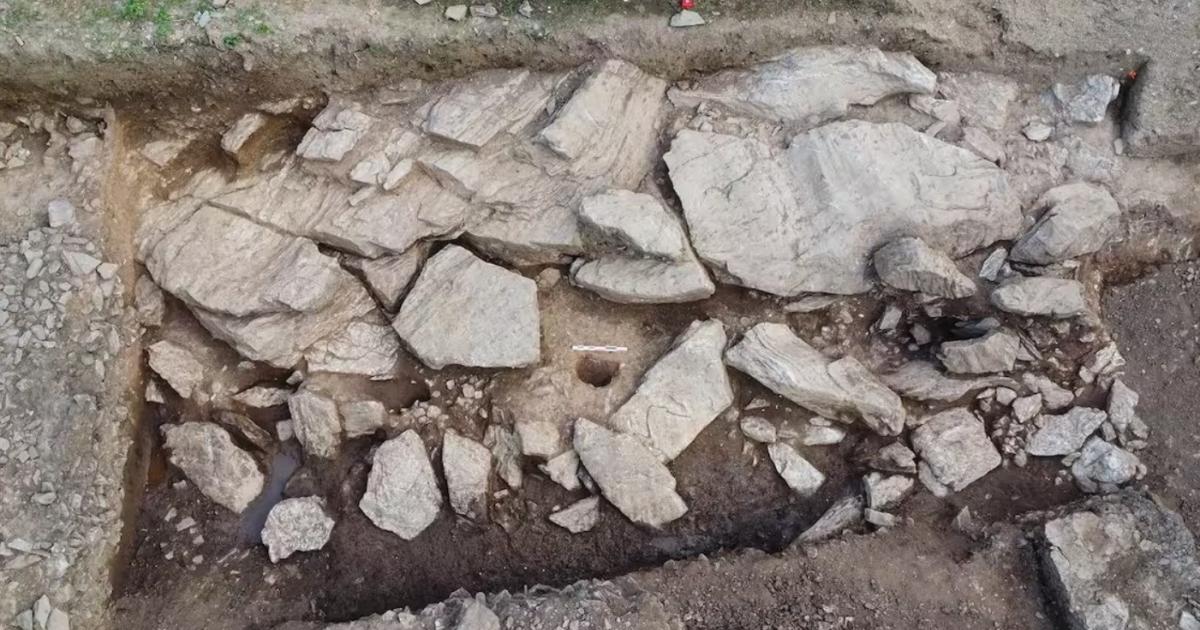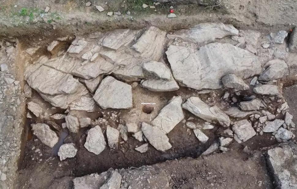 Το στοιχείο που τράβηξε την προσοχή των ερευνητών, ήταν η παρουσία μεγάλων σχιστολιθικών όγκων -μερικοί είχαν πάνω από 1,50 μέτρο μήκος- διατεταγμένων με φαινομενικά χαοτικό, αλλά σαφώς σκόπιμο τρόπο: για να σχηματίσουν ένα συγκεντρωμένο επίχωμα από πέτρες.
